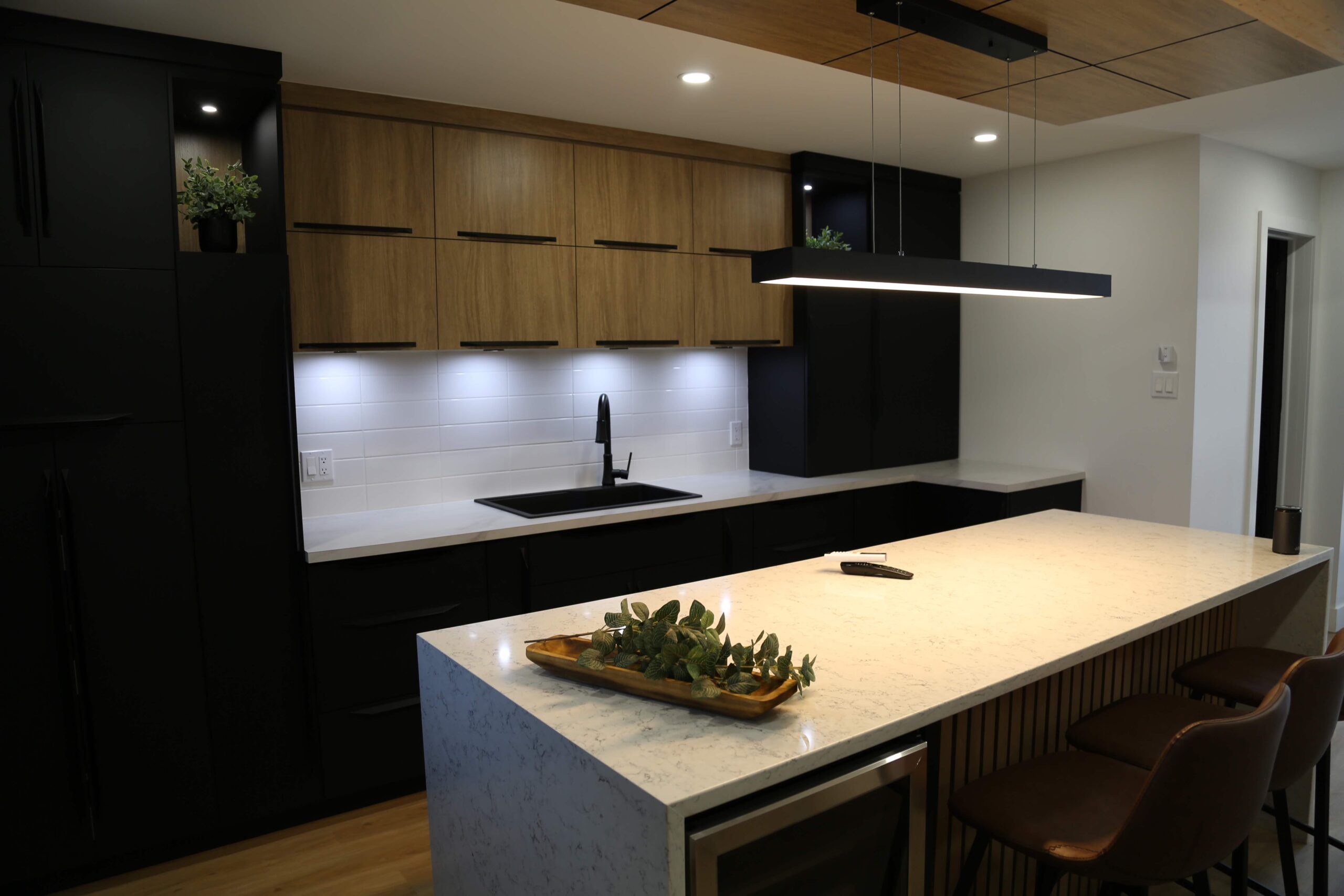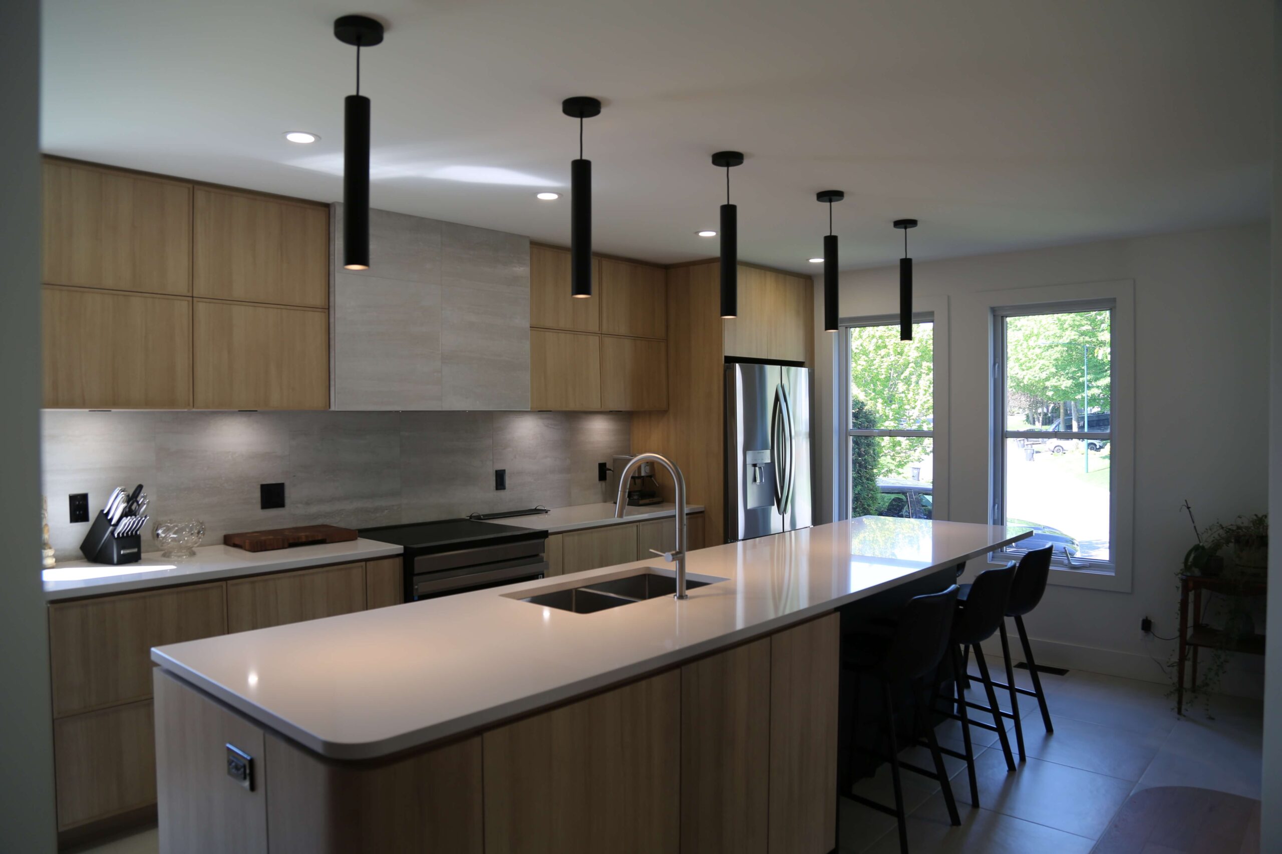 L’ébénisterie sur mesure réalisée par MA Signature Élégance transforme vraiment l’espace. Les armoires et bibliothèques s’intègrent parfaitement dans la pièce, optimisent chaque centimètre et offrent un rendu très élégant. Le bois noble utilisé apporte une touche authentiquement raffinée.